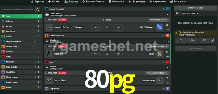 A aposta 80pg oferece aos jogadores a experiência mais conveniente de apostas em eSports!